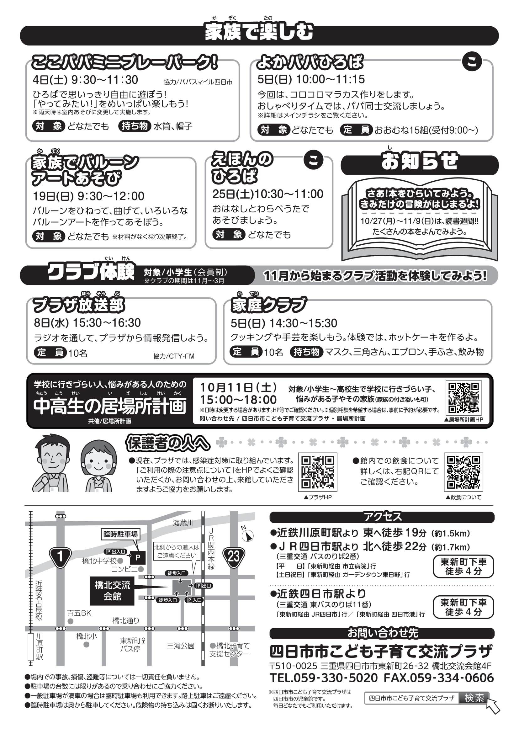 終了 小学生版10月こここ通信 中高生の居場所計画 開催日 2025-10-11 会場 四日市市こども子育て交流プラザ 住所 三重県四日市市東新町26−32 料金 不明 イベント詳細を見る https://cocoplaza-yokkaichi.jp/info_mation/【こここ通信-10月イベント号が完成しました-4/ カテゴリー 子育て・子ども向け