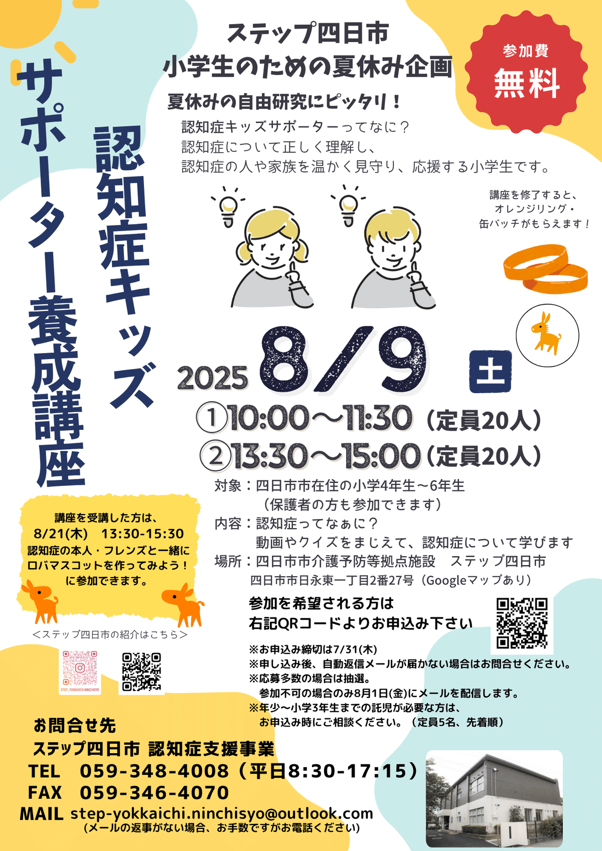 今回は、夏休み期間に開催する認知症キッズサポーター養成講座のご案内です。